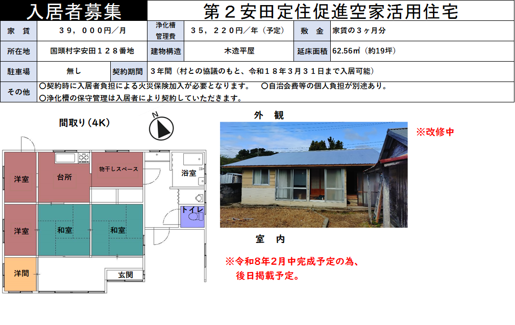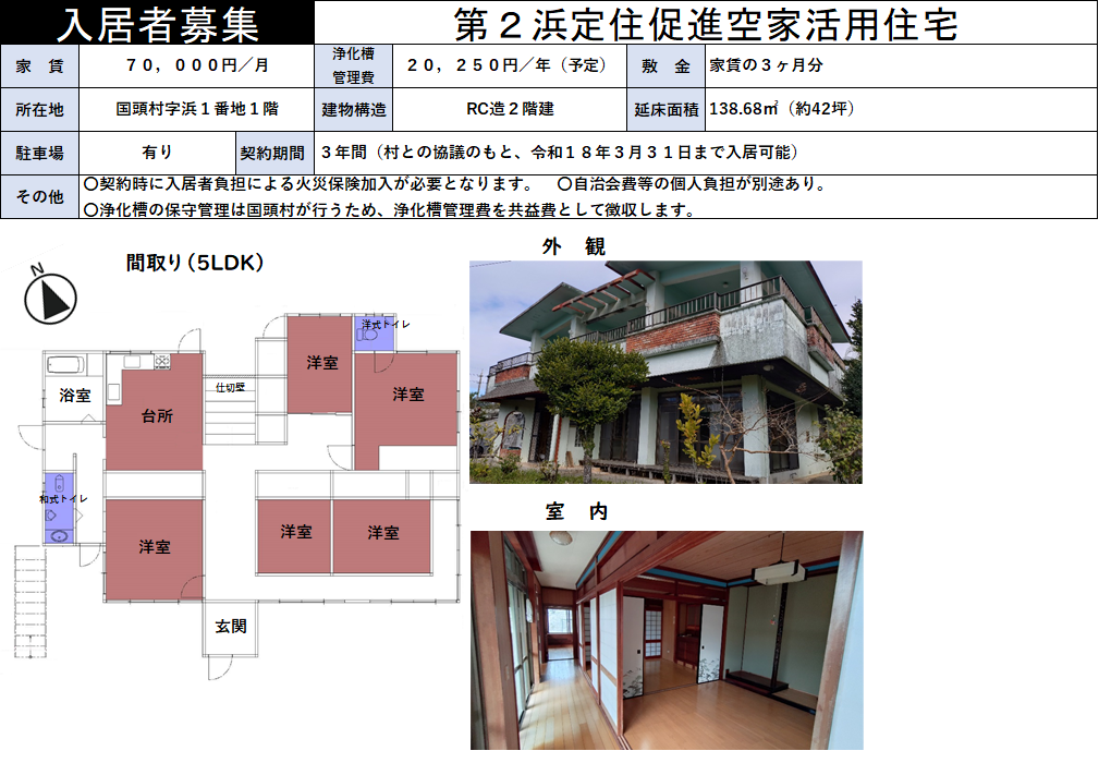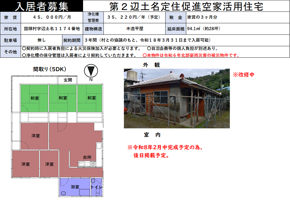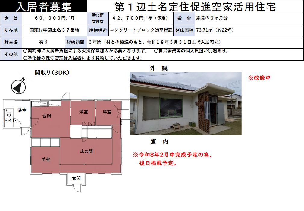 国頭村定住促進空家活用住宅6戸の入居者を下記のとおり募集いたします。