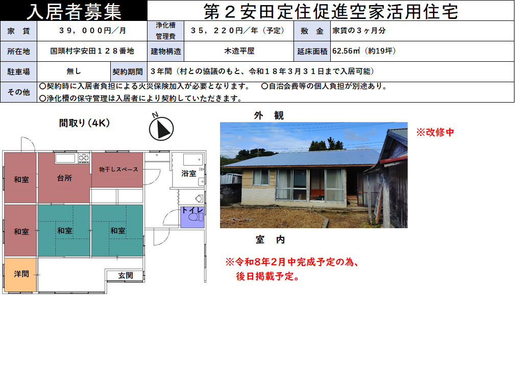 契約期間:3年間 ※村と入居者に異存がない場合は、3年ごとに契約更新を行い最長10年間まで入居可能とする。