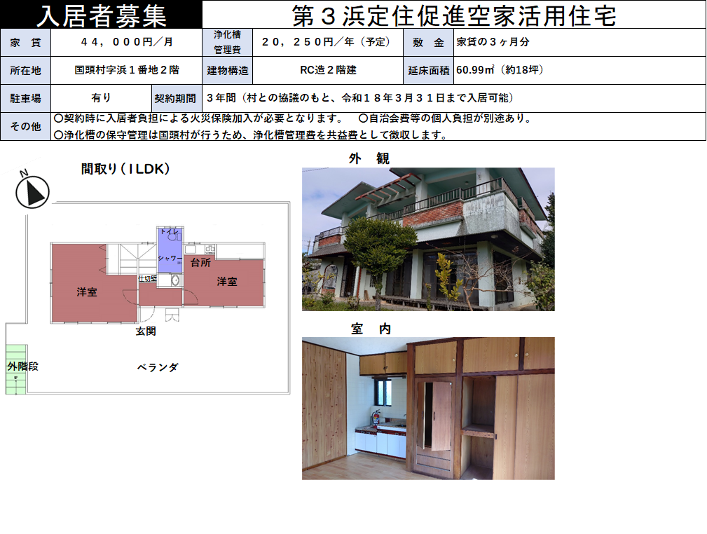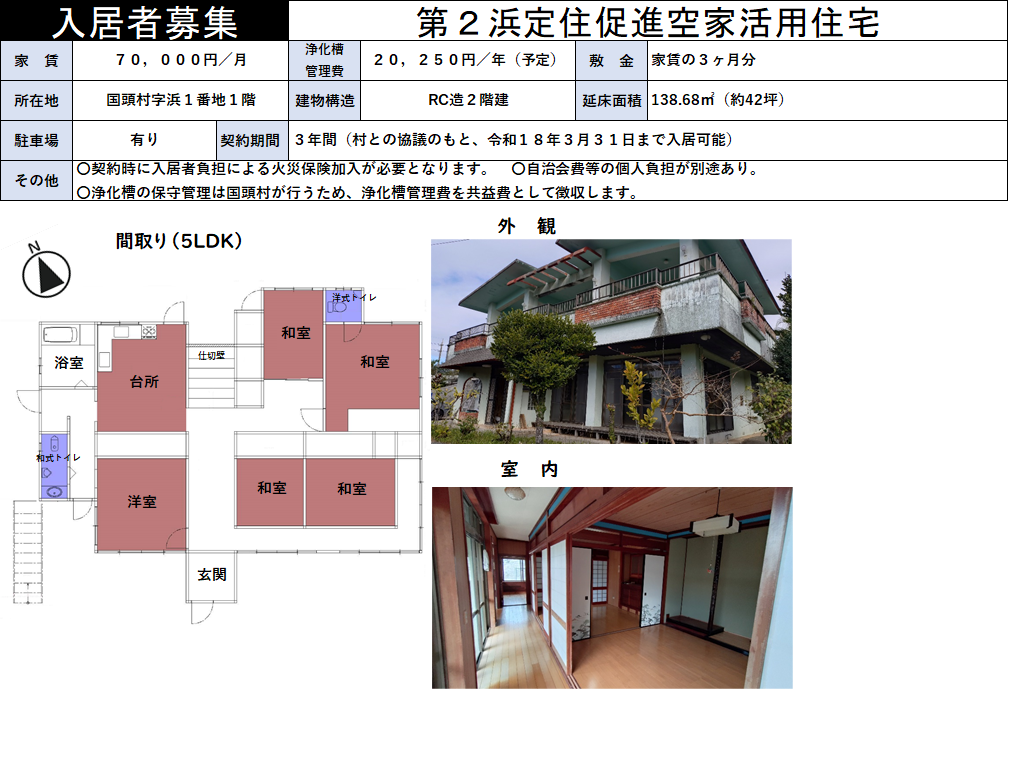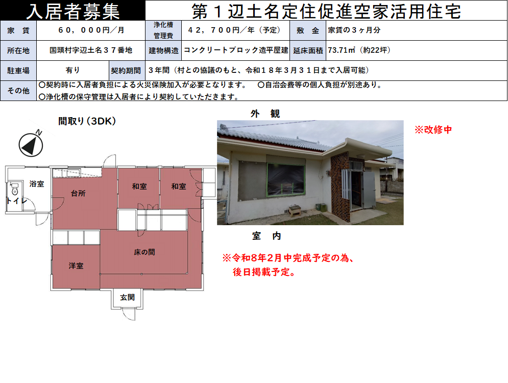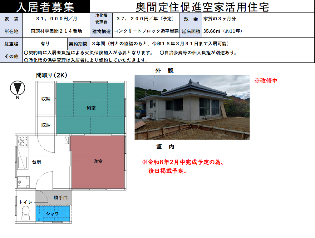 国頭村定住促進空家活用住宅6戸の入居者を下記のとおり募集いたします。